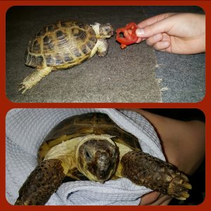 Kilpikonna Emil oli vierailulla. Syötimme Emiliä, laitoimme hänet kylpyyn ja rakensimme hänelle vuoren, jonka yli kiivetä.